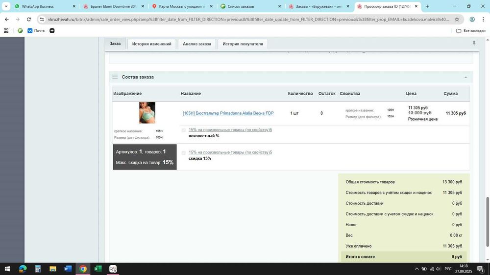 В день моей покупки 7.09.2021 курс рубля к доллару был 72,95 рубля. Я заплатила с учетом моей 15% скидки как постоянного покупателя - 11305 рублей. Получается 11305 делим на 72,95 и получаем 154,96 доллара. Сегодня курс доллара к суму 12160 сумов. Цена бюстика на сегодня в сумах 1 884 800. Если на день покупки курс изменится, то пересчитаем, разумеется. Все детали моей покупки представлены на фото, можете убедиться.