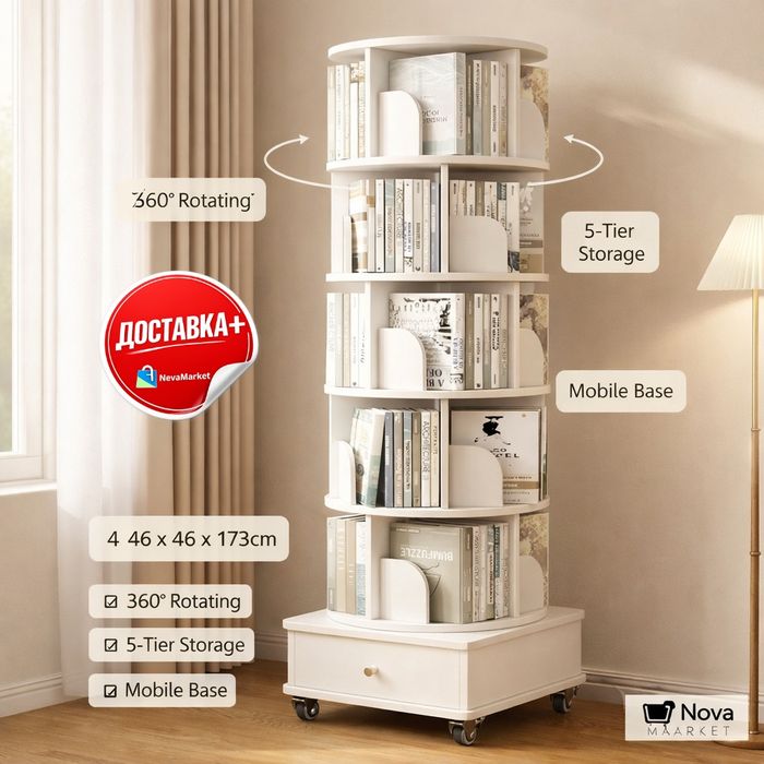 Крутящаяся книжная полка 360° на колёсах, 5 уровней, 173 см