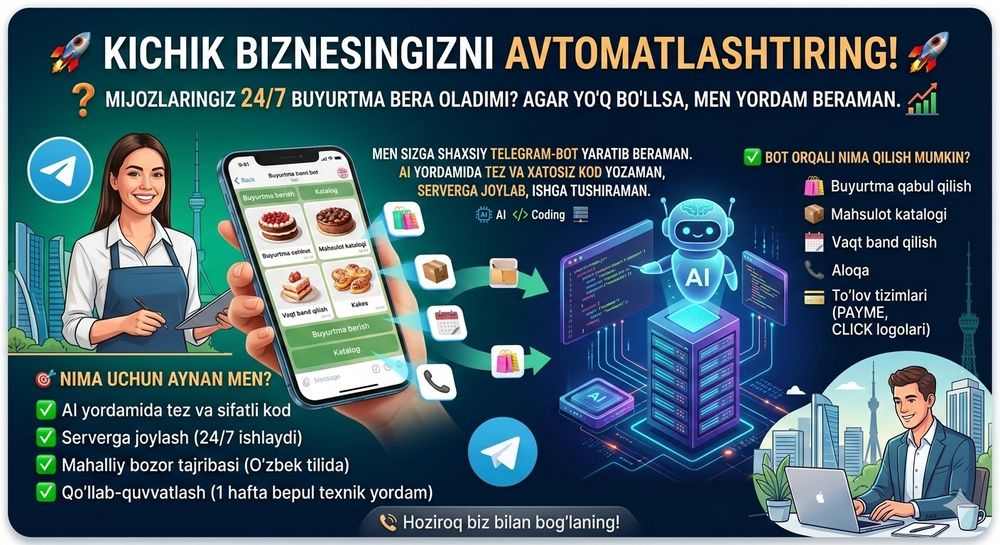 Veb-sayt yaratish / avtomatlashtirish Surxondaryo viloyati ⭐ OLX.uz O‘zbekiston e‘lonlar taxtasida tez va oson xizmatni topish yoki ko‘rsatish mumkin ✔️ Eng yaxshi xizmatni OLX.uzda toping!