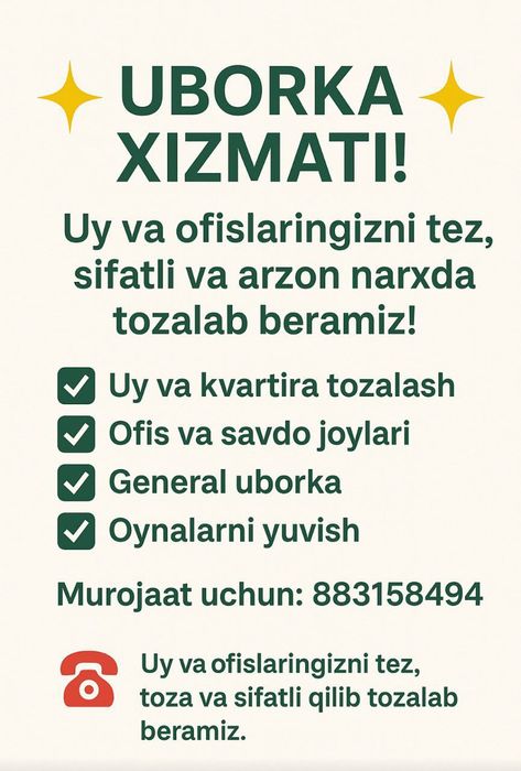 Tozalash / yig'ishtirish Qarshi ⭐ OLX.uz O‘zbekiston e‘lonlar taxtasida tez va oson xizmatni topish yoki ko‘rsatish mumkin ✔️ Eng yaxshi xizmatni OLX.uzda toping!