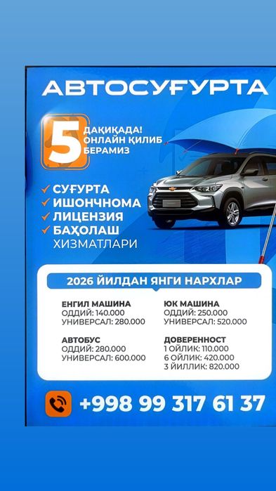 Разнообразные услуги, связанные с авто и мототранспортом, представлены в сервисе OLX.uz в Каракалпакстан. Здесь вы найдете предложения от автошкол, услуги автомойки и шиномонтажа, возможность воспользоваться эвакуатором и провести обследование на СТО. Полный спектр услуг, которые могут понадобиться для вашего автомобиля, у нас на OLX.uz Каракалпакстан.