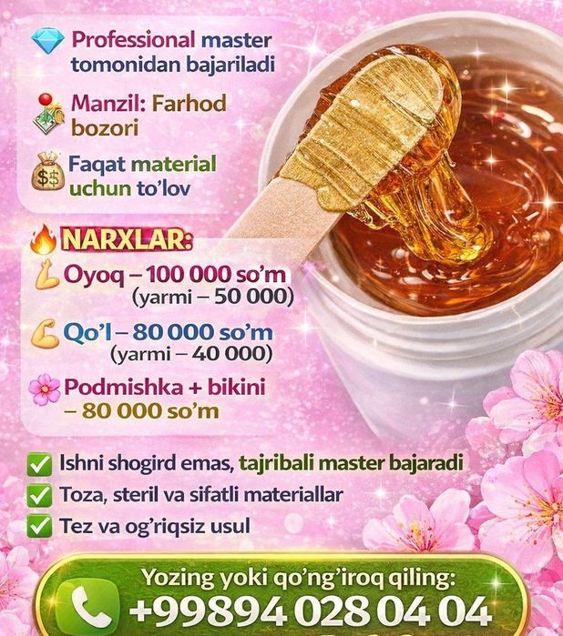 Разнообразные услуги в сфере услуг красоты и здоровья Келес — макияж, массаж, маникюр, стрижки, услуги косметолога и многое другое в сервисе OLX.uz Келес. У нас вы найдете множество предложений от частных мастеров и салонов красоты по самым выгодным ценам. Все виды услуг в объявлениях OLX.uz Келес.